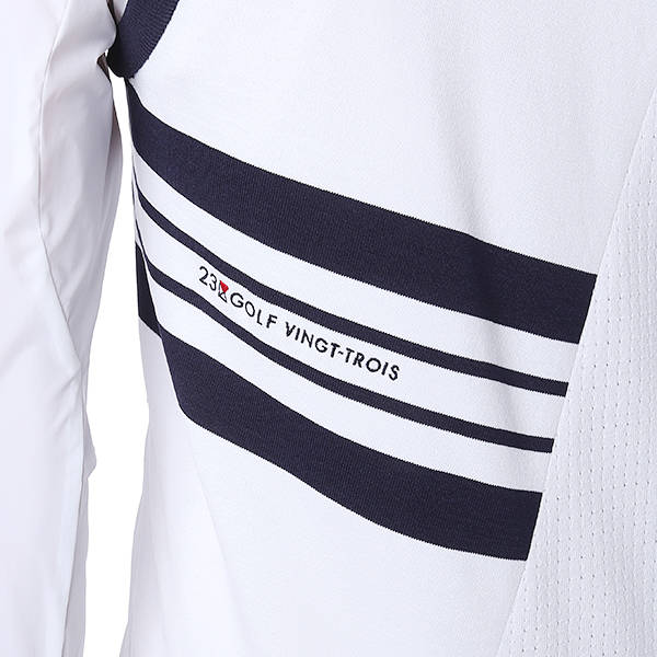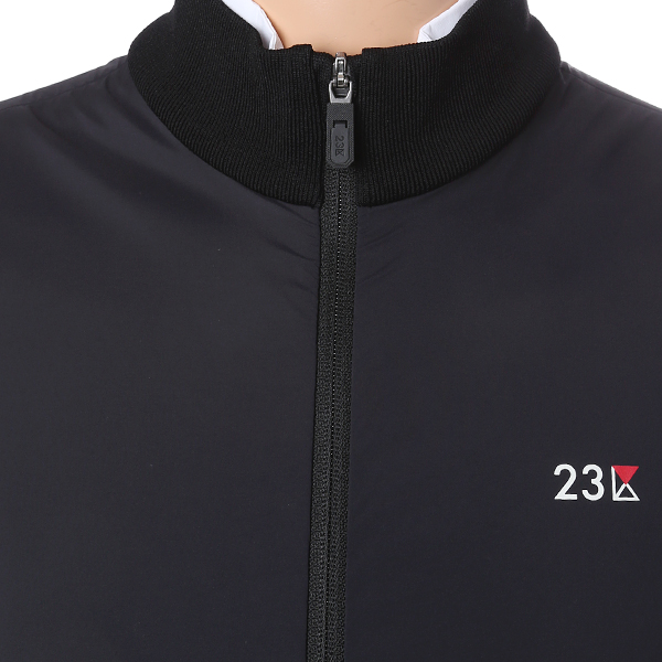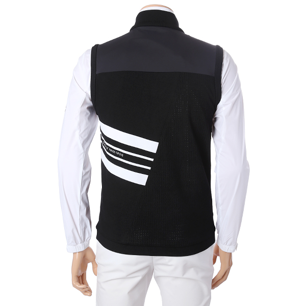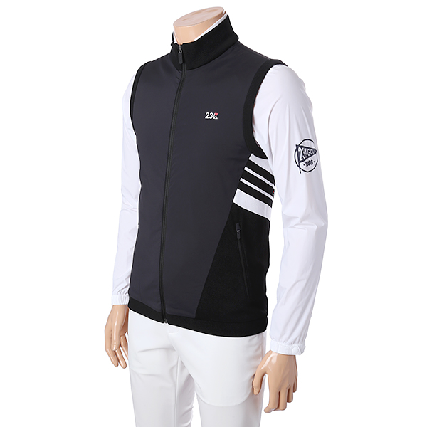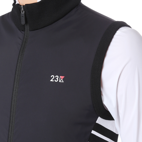 - 옆 라인에서 등판 사선 방향으로 컬러 배색과 로고 플레이 포인트 - 우븐 소재MIX 레이어드 니트 베스트 아이템 |