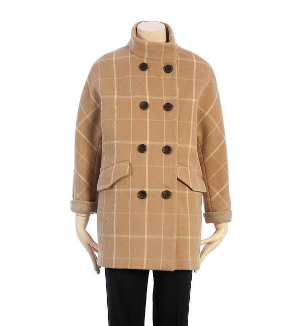 CC collect, 체크 패턴이 전체적으로 들어가있어 멋스러운 스타일 감각을 연출하는 더블버튼 코트입니다
