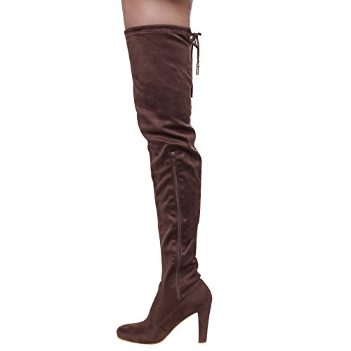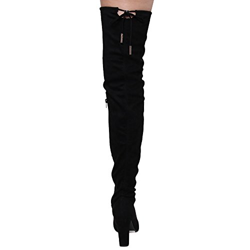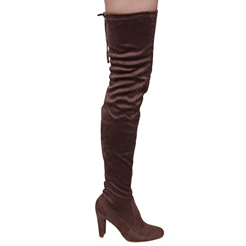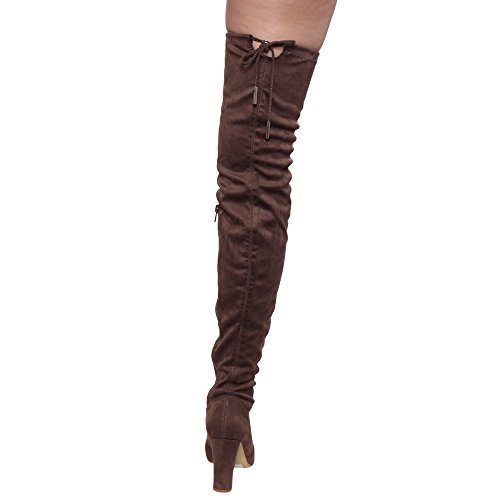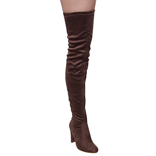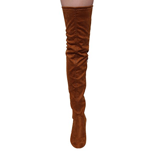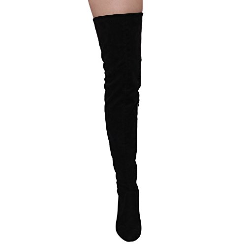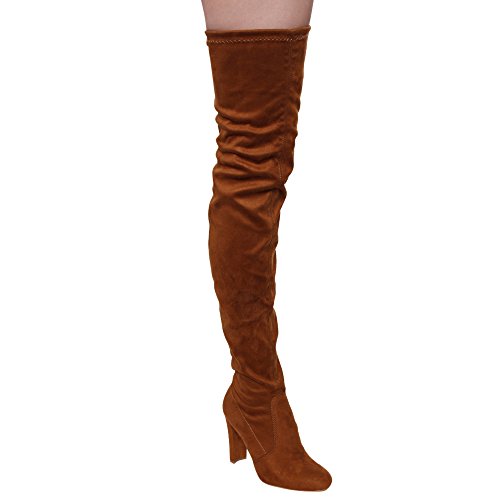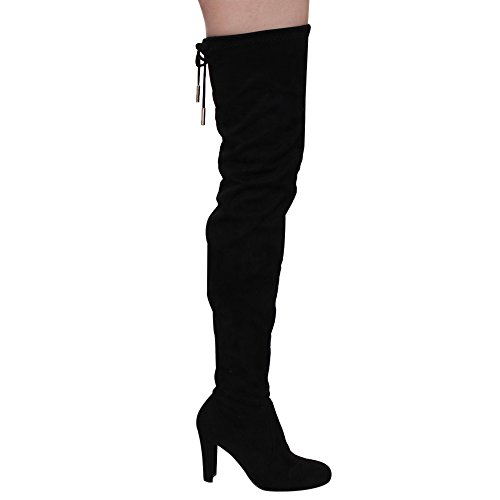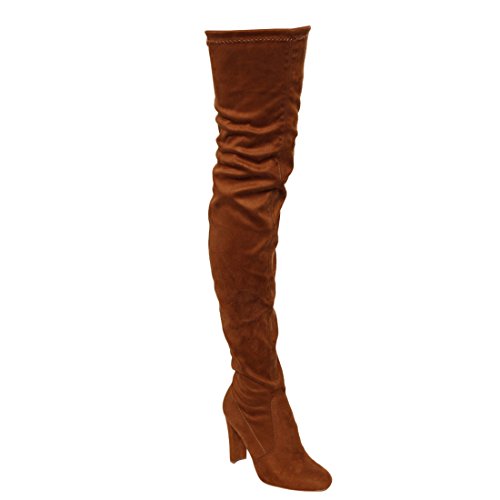 Product DescriptionThis style is a slim fitting thigh-high boot that's perfect for your autumn excursions. Designed with stretch faux suede upper, pull-on wear with tie-back, inside zipper, and high block heel.0