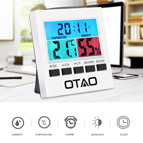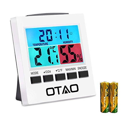 Otao Indoor Thermometer Hygrometer Digital Humidity Monitor Gauge with Backlight Alarm Clock with Colorful LCD Temperature Gauge Humidity Meter(2 Batteries Included)