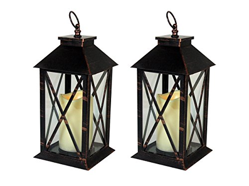 -. Feature : CANDLE LANTERNS. This set of 2 classic style candle lanterns are a cool distressed brown finish and come with the glass panels already assembled. Each one has a flickering LED candle attached inside. / BRONZE DECORATIVE LANTERN SET. / BATTERY OPERATED LANTERNS. With the SET-AND-FORGET timer functioned, the candle can be left on and will stay on for 5 hours and then remains off for 19 hours, only to automatically light up your home again for 8 hours, simply by switching at the bottom of the lantern - When the timer is not in use, just turn ON or OFF the lantern as a regular light. WATERPROOF WEATHER RESISTANT plastic so this lantern can be used for outdoors or indoors / INDOOR/OUTDOOR LANTERNS. The LED candle has a nice, soft, warm flickering glow. Since the candles are flameless they are smoke free and worry free. Safe to use around pets and children. Perfect for those night sitting out on the deck, by the beach or at the lake. Each lantern comes with a loop at the top so you can hang it anywhere. / LANTERN SIZE: 13"H, CANDLE: 3" x 4.5". on/off switch. Requires 3AAA batteries (NOT INCLUDED). DECORATIVE USES: display on a fireplace mantel, tabletop centerpiece, above your kitchen cabinets, bathroom, living room, window sill.