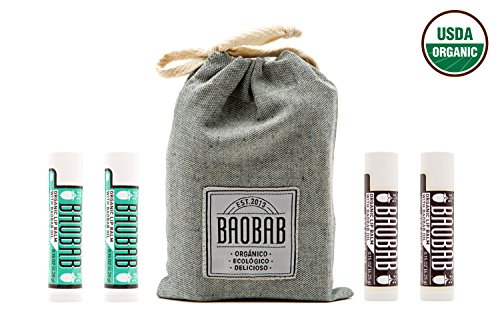 Made with Amazing Ingredients for Caring of the Skin, and No Dirty Stuff at all! BAOBAB Organic Lip Balms are made with ideal ingredients from Nature, like sunflower oil, extra virgin olive oil, shea butter, hemp oil and beeswax.