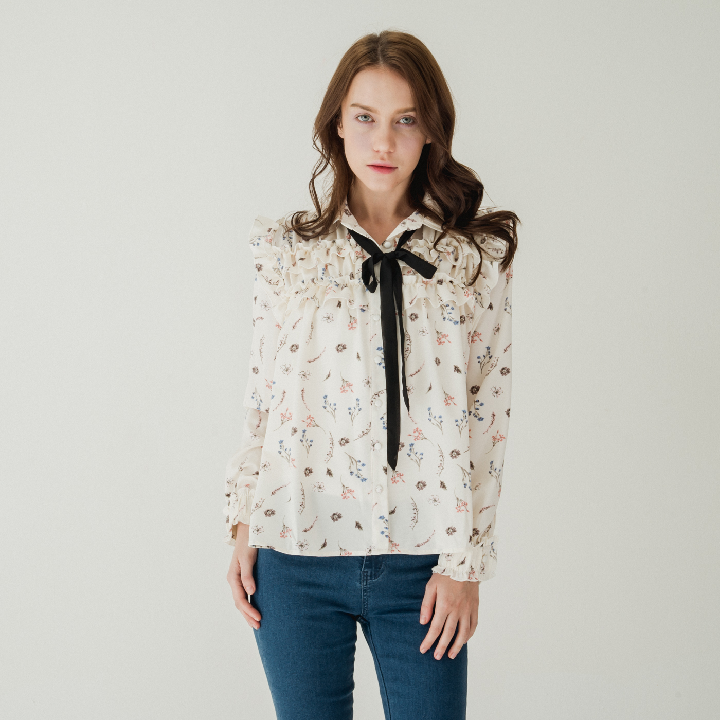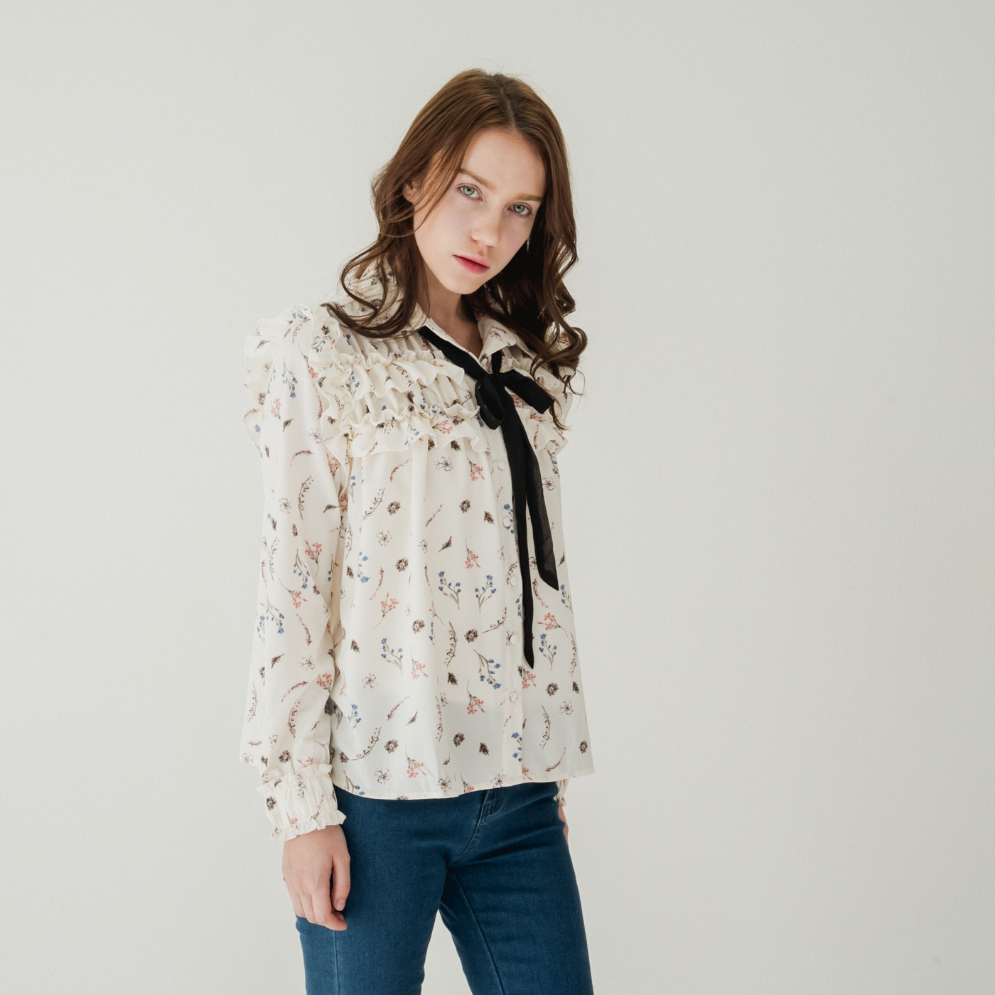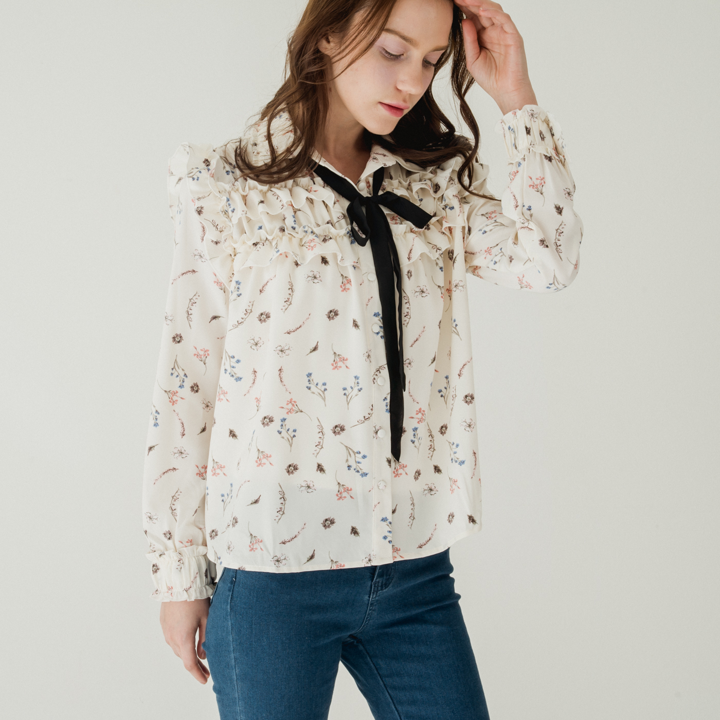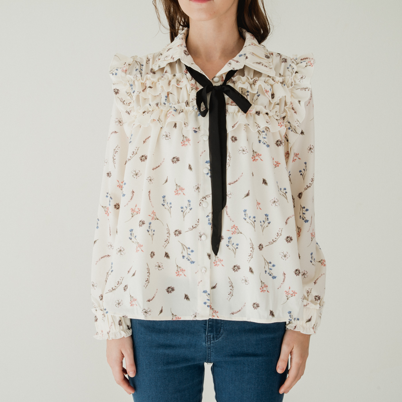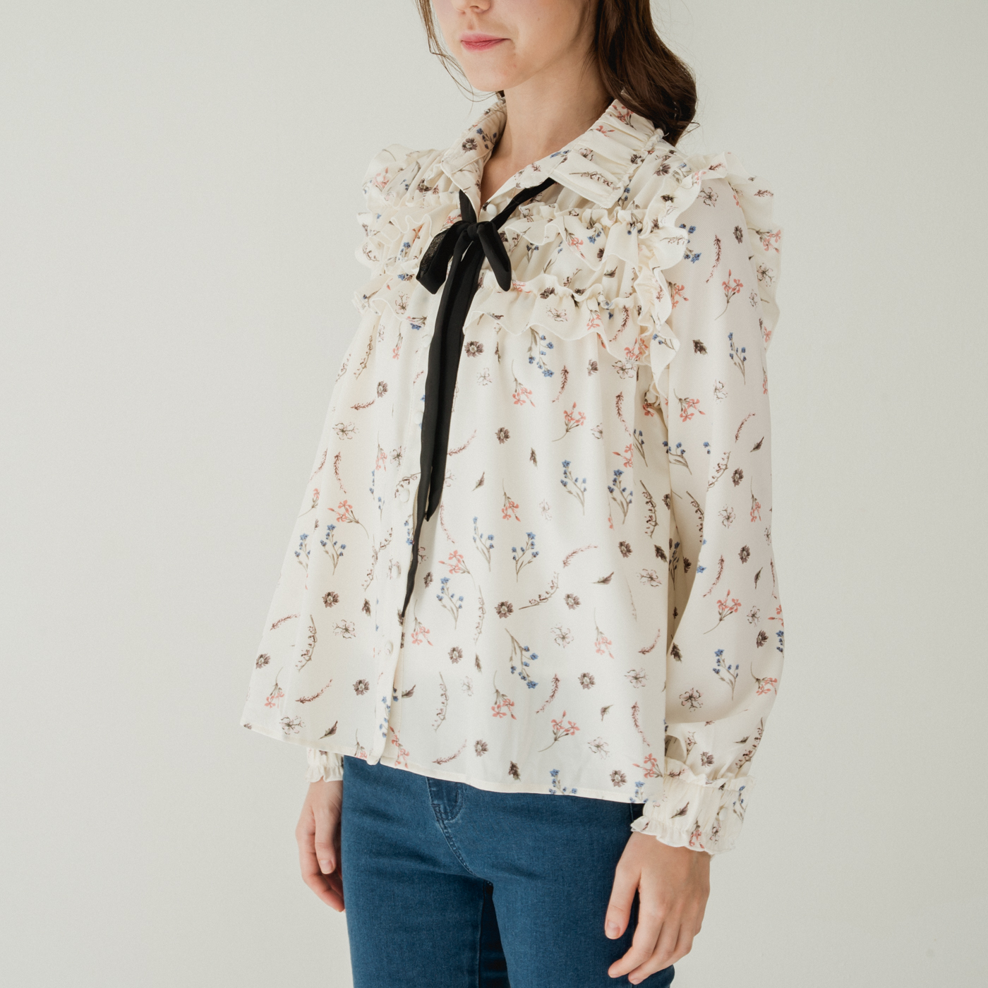 여성스러운 프릴 디테일과 플로럴 패턴의 넥 리본 셔츠입니다.