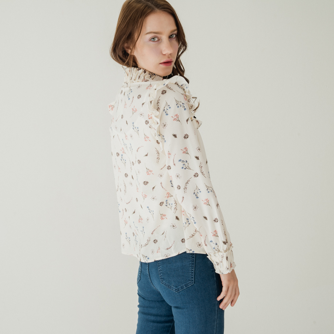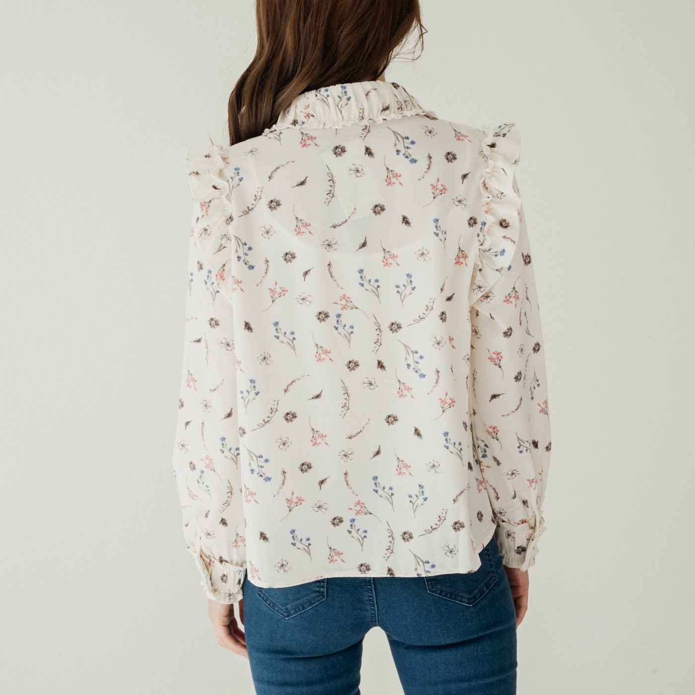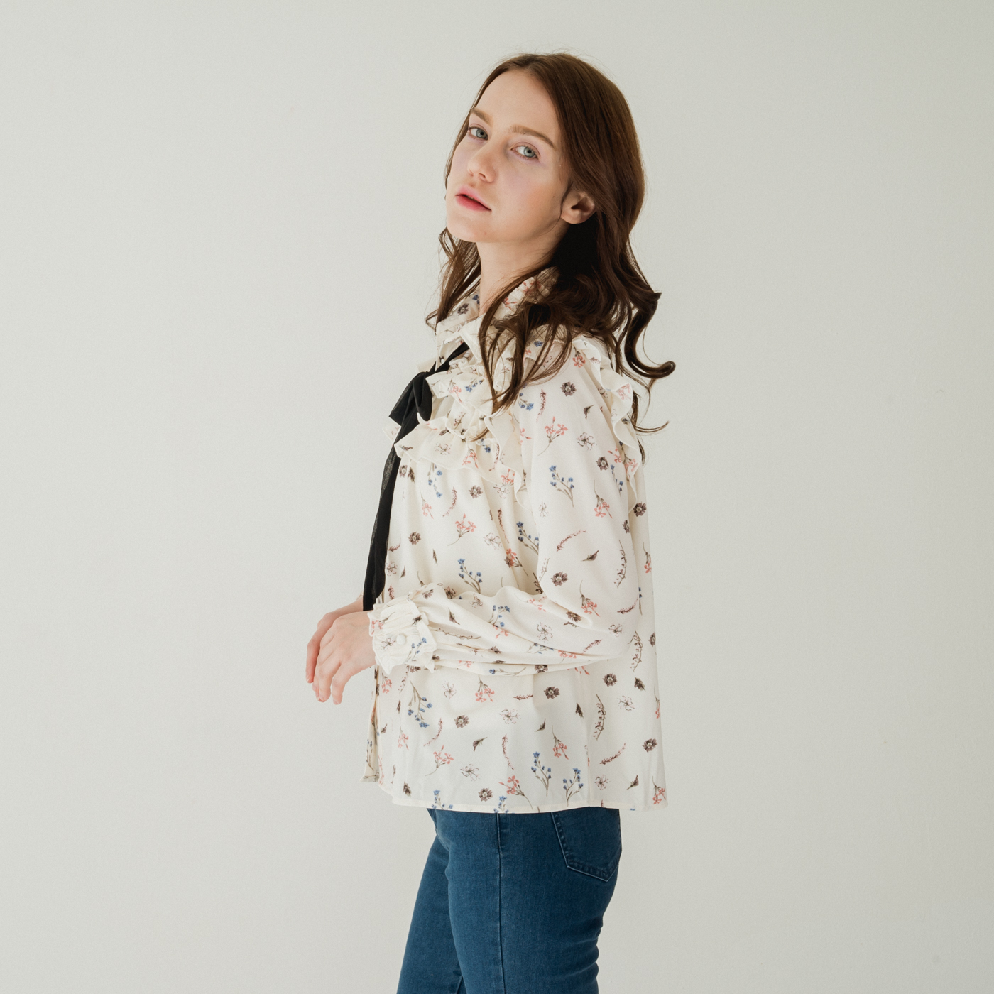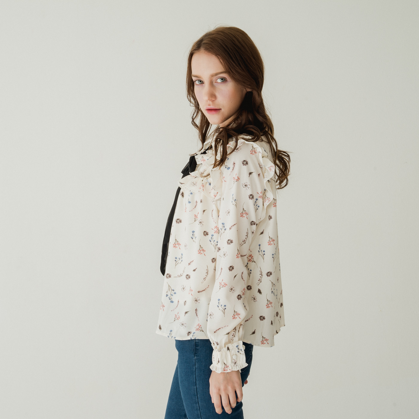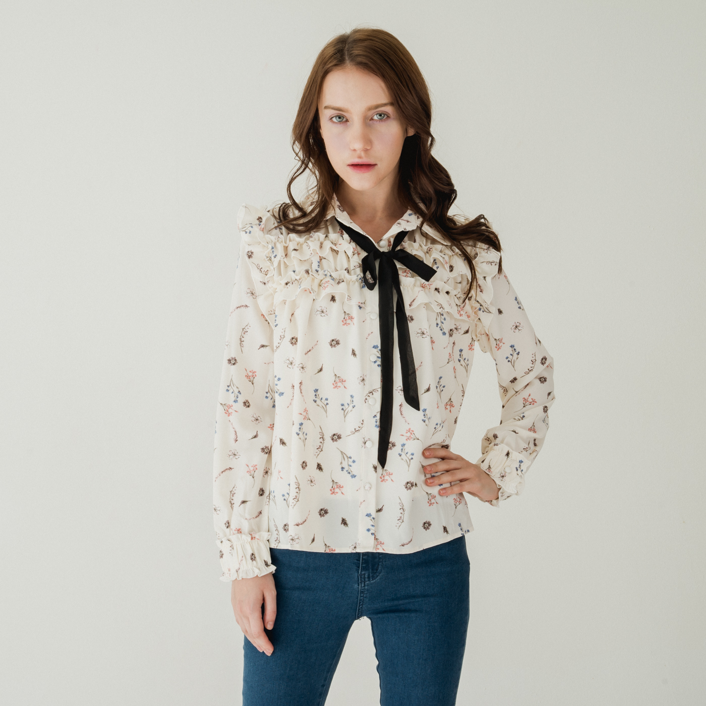 여성스러운 프릴 디테일과 플로럴 패턴의 넥 리본 셔츠입니다.