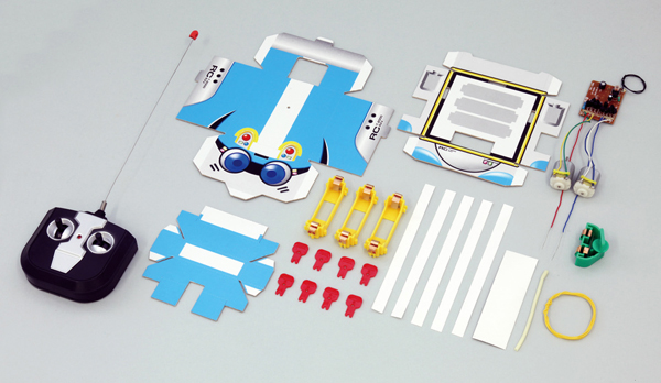 ●コントローラー×1、紙製ボディ(上)×1、紙製モーターケース×1、紙製ボディ(下)×1、電池ボックス×1、基板×1、ゴムチューブ×1、両面テープ(薄)×5、両面テープ(厚)×1195g