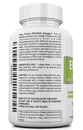 -. Feature : PROMOTES HEART & BRAIN HEALTH - Supports Healthy Cardiovascular System, Joint Flexibility, Eye Health and Proper Nerve Function / Extra strength fish oil that goes well with multi-vitamins, vitamin d and d3, coq10, resveratrol, zinc, and vitamin e. / A perfect dietary compliment for: weight loss, bodybuilding, reducing inflammation, a slim waist, and optimum nutrition. / ADVANCED Non-GMO FORMULA / 100% SAFE AND FDA APPROVED FACILITY - All Alice Food supplements are Made in USA at a GMP Certified, FDA inspected and approved facility. You can be completely confident that Alice Foods manufacturing processes are designed to give top P.R.Iority to your health such that you only benefit in every possible way. Available with Subscribe and Save