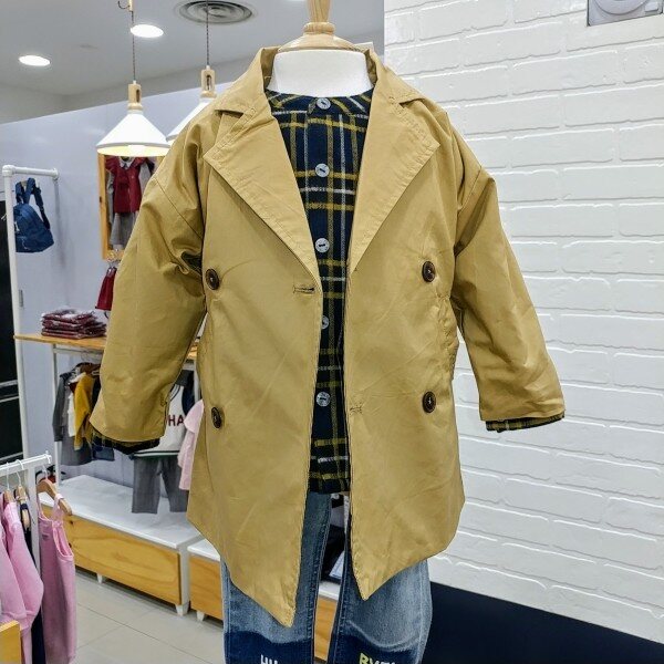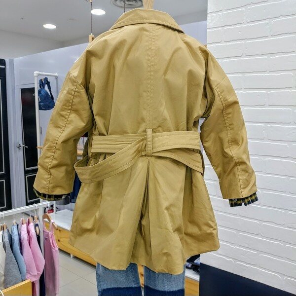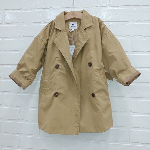 박시핏의 더블단추로 포인트를 준 공용 트렌치 코트로 허리끈과 포켓 로고자수가 포인트일 스타일입니다.