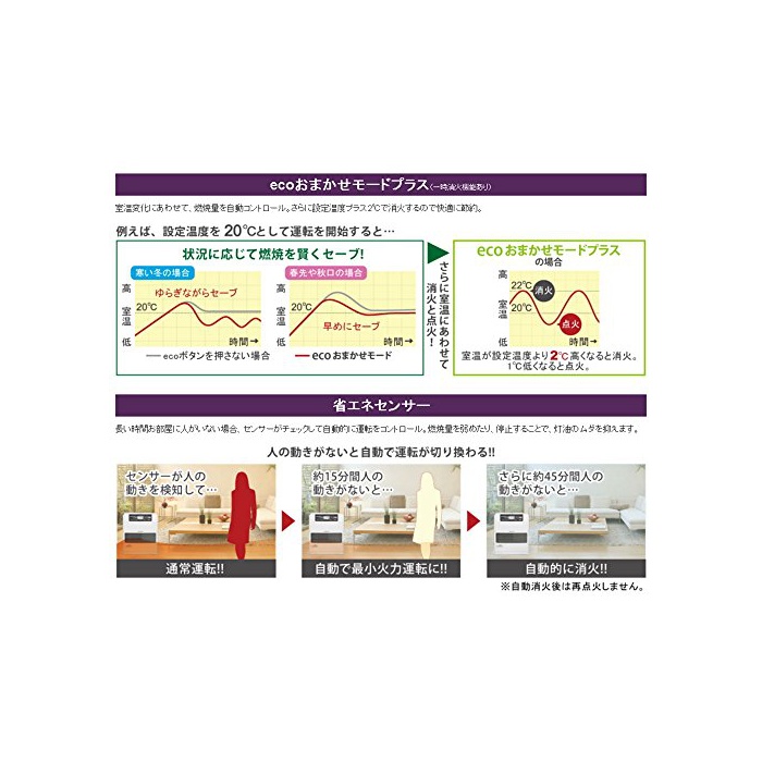 에너지 절약 센서 긴 시간 방에 사람이 않은 경우,센서가 체크해 자동적으로 운전을 콘트롤.연소량을 약하게 하거나,정지 하는 것으로,등유의 헛됨을 억제합니다.