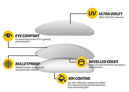 All of our lenses offer 100% UV protection, impact resistance that exceeds ANSI Z80.3 and EN 1836:2005 standards, multiple layers of the most intense and rugged hard coatings and hydrophobic coatings to keep your lenses clean and protected and, of course, a 100% money back satisfaction guarantee.