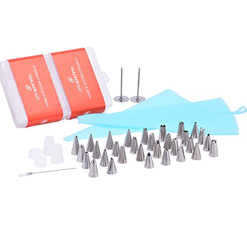 OTHERMAX 39 Pcs Cake Decorating Tips Kit - Stainless Steel Piping Nozzles/Piping Tips Set with 2 Reusable Silicone Pastry Bags, 2 Reusable Couplers, 2 Flower Nails and 1 Cleaning Brush & Gift Box