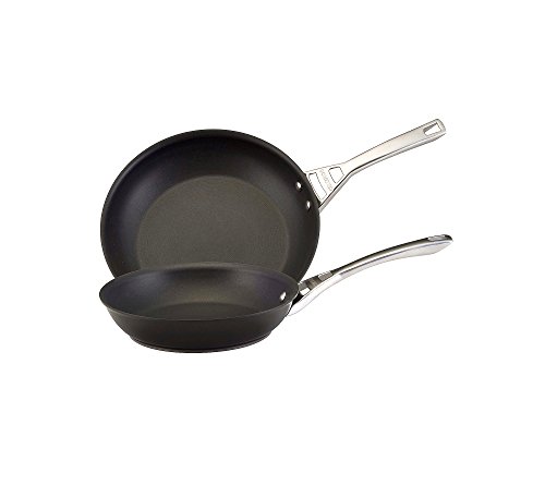 One of the most used pans in cooking, you'll want to outfit your kitchen with skillets in a variety of sizes. This twin pack will get you started. The sloped sides let foods slide out easily, and the nonstick surface makes cleanup effortless. Use the smallest pan for frying a few eggs, grilling a hot ham and cheese, or making "silver dollar" pancakes, and use the larger pan for searing steaks, sautéing vegetables, or creating one-dish meals.Feature