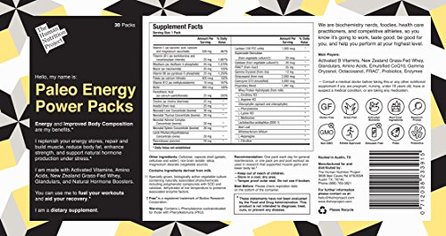 -. Binding : Health and Beauty -. Brand : The Human Nutrition Project -. EAN : 0712038233922 -. Feature : RESEARCH PROVEN to BURN BODY FAT and BUILD LEAN BODY MASS in college athletes across many sports; This is the best natural sports nutrition multivitamin on the market with activated b vitamins, lsified CoQ10, octacosanol, gamma oryzanol, choline, inositol, amino acids, antioxidants, enzymes, probiotics, grass-fed whey and organ glandular; Perfect for paleo, keto, and low carb diets. This ultimate formula was not only developed for performance but for both mens and womens health / ESSENTIAL GRASS FED WHEY AND ORGAN MEAT SUPERFOODS; Glandulars have lost their place in out diet despite being used traditionally as nutritional powerhouses; There is a reason predators eat the organs of their prey first. Adrenal, liver, spleen, thymus, pituitary, and hypothalamus glandulars provide a unique concentrated source of crucial nutrients that are lacking in athlete diets; WADA and athlete safe, contains no banned substances, only protein and vital naturally bound micronutrients / CONVENIENT PACKS AND UNIQUE INGREDIENTS for stimulant free and caffeine free energy; Easy on the go daily packets for pre and postworkout; Octacosanol improves stamina and endurance by boosting oxygen and improving glycogen storage; Gamma Oryzanol improves strength and naturally supports hormone balance in men and women / WE PUT PEOPLE ABOVE PROFITS; The Human Nutrition Project's mission is to revolutionize what it means to be healthy in the athletic world; You can count on us to provide high quality products in an industry where profits and low quality ingredients are often put above concern for people's health; Each Pack is Paleo, Gluten free, non-GMO, and athlete safe; Free of any artificial sweeteners, flavors, or colors. Real whole food, nothing artificial / DEVELOPED BY DR. NOAH MOOS AND NATALIE PICCHETTI, ELITE ATHLETES THAT SPECIALIZE IN SPORTS NUTRITION; Frustrated by the poor quality and harmful ingredients typical sport nutrition supplements, they went on a mission to develop high quality performance enhancing functional foods that athletes can trust; Their goal is to improve physical fitness and to maintain overall health benefits for an athlete who is constantly pushing the envelope on a weekly basis -. IsAdultProduct : 0 -. Label : The Human Nutrition Project -. LegalDisclaimer : Disclaimer: *These statements have not been evaluated by the Food and Drug Administration. These products are not intended to diagnose, treat, cure or prevent any disease. If you are pregnant, nursing or have a known medical condition, are under a physician's care or taking prescription medications, we sest consulting with your health care provider before starting on any dietary supplements -. Manufacturer : The Human Nutrition Project -. ProductGroup : Health and Beauty -. ProductTypeName : HEALTH_PERSONAL_CARE -. Publisher : The Human Nutrition Project -. Studio : The Human Nutrition Project -. Title : Paleo Energy Power Packs Multivitamin. Natural Pre Workout Supplement w/ Grass Fed Whey, Glandulars, Probiotics, Vitamins. Burn Fat, Gain Lean Muscle, Boost Energy, Focus, Recovery. Clean Preworkout -. UPC : 712038233922