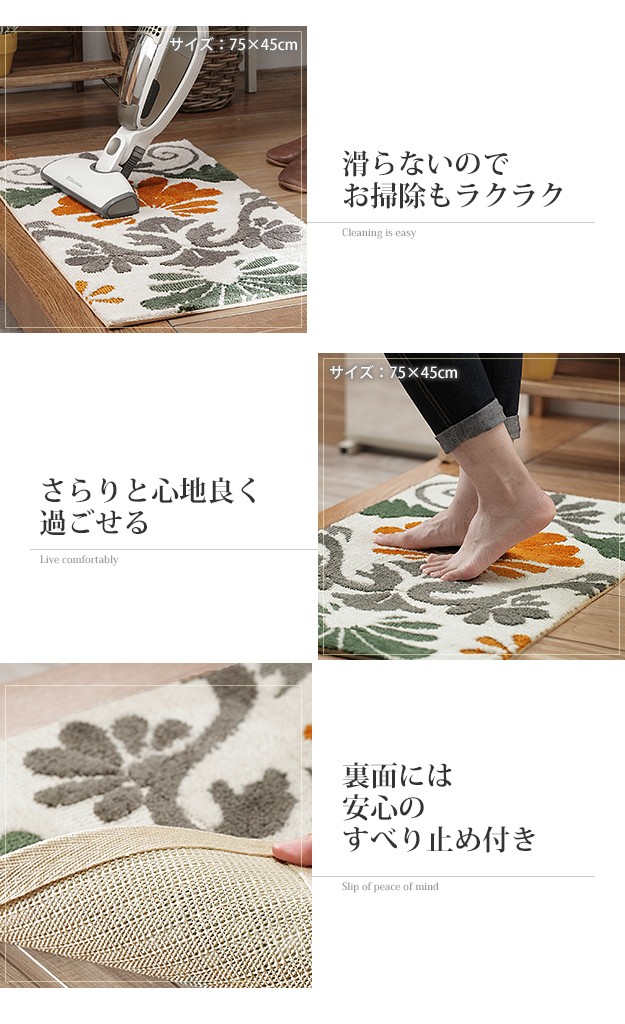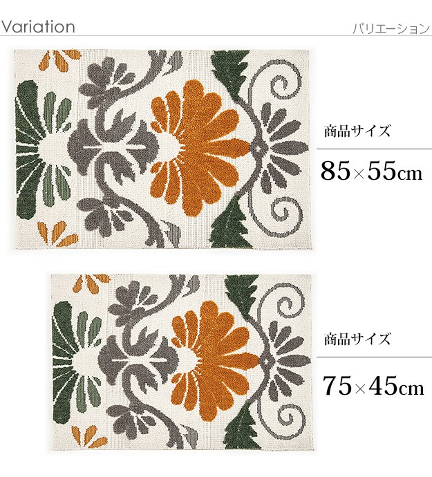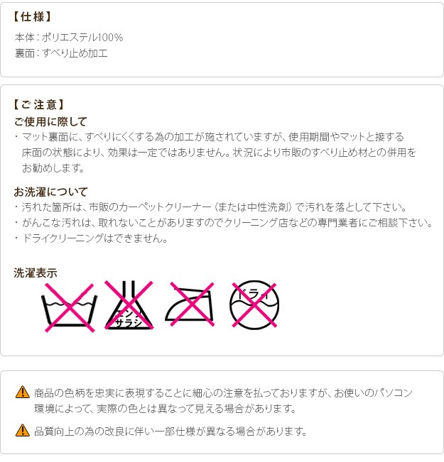 ※メーカー直送のため代金引換はお受けできません。※沖縄・一部離島は別途送料がかかります。お見積もりいたしますのでお問い合わせ下さい。【仕様】本体:ポリエステル100%裏面:滑り止め加工【サイズ】本体:約75x45cm重量:約0.5kg毛足長さ(パイル):約10/6mm株式会社ナカムラ(33100374)