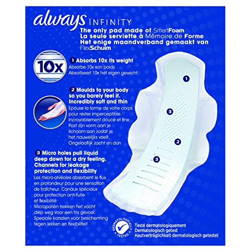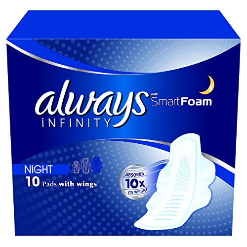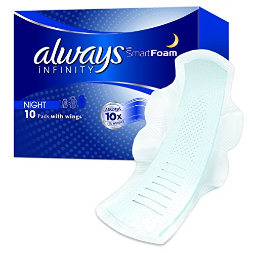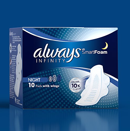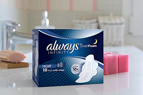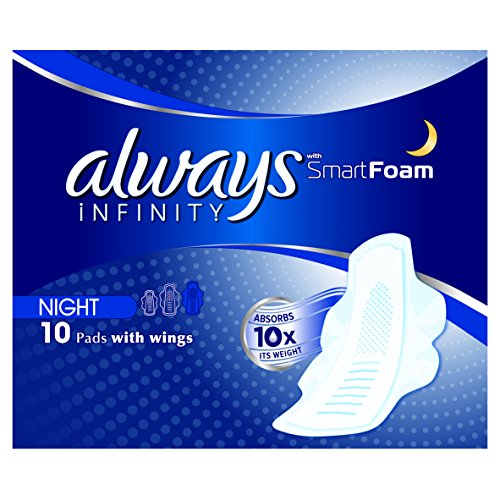-. Binding : Lebensmittel & Getränke -. Brand : Always -. EAN : 4015400684534 -. Feature : 1. SmartFoam Pad der Welt. Absorbiert das 10 x Gewicht noch Sie kaum spüren es. / Passt zu Ihren Körper so dass Sie kaum spüren es. / Absorbiert das 10 x Gewicht / Kanäle für Auslaufschutz und Flexibilität / Mikro-Öffnungen ziehen Liquid tiefenwirksam für ein trockenes Gefühl. -. IsAdultProduct : 0 -. Label : Always -. Manufacturer : Always -. Model : 106969434 -. MPN : PR178300000 -. PackageQuantity : 1 -. PartNumber : PR178300000 -. ProductGroup : Drogerie & Körperpflege -. ProductTypeName : HEALTH_PERSONAL_CARE -. Publisher : Always -. Studio : Always -. Title : Always Infinity Damenbinden mit Flügeln für die Nacht, 10er-Packung