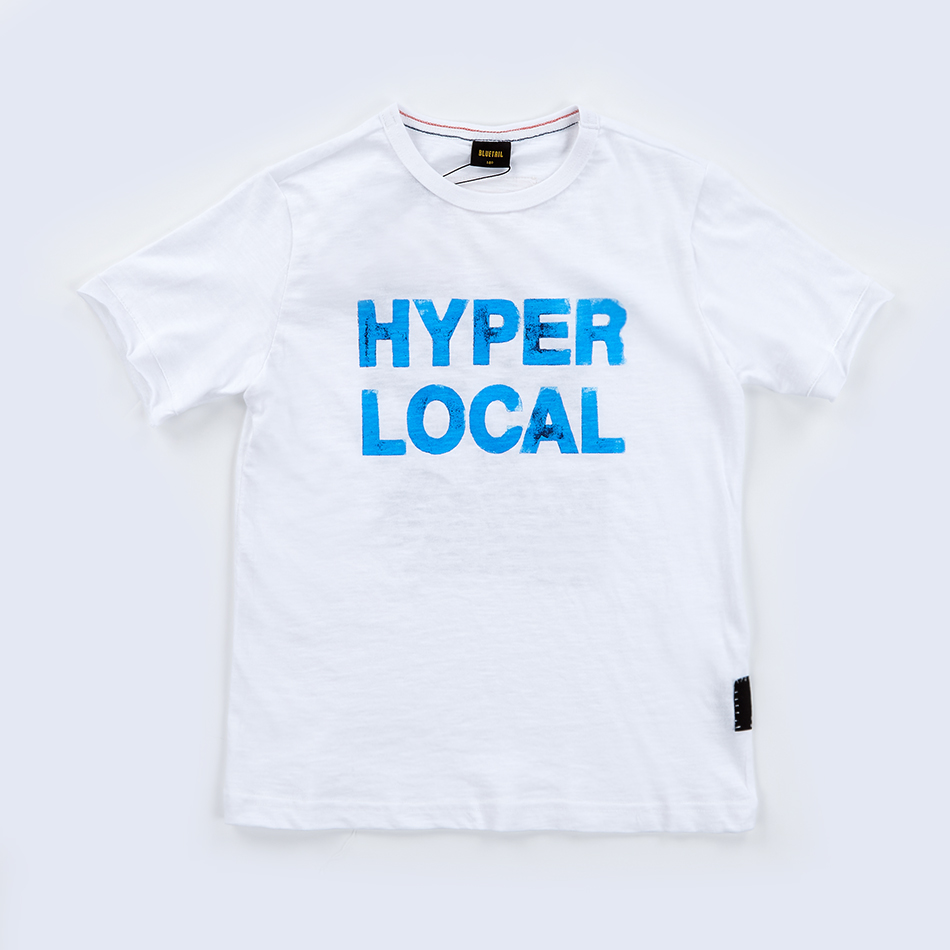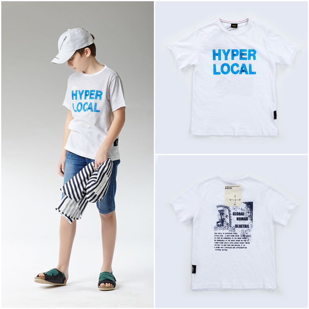 투명하고 푸른 물느낌의 레터링으로 쿨하게 제안한 클린한 화이트 반팔 티셔츠입니다.