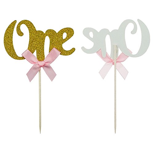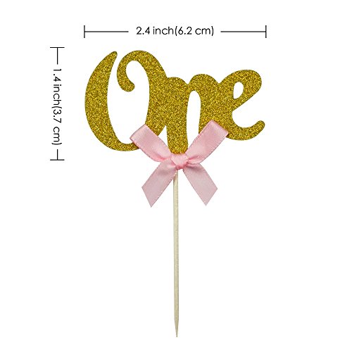 - Gold One Birthday Cupcake Toppers: One birthday cake topper size approx. 1.4 x 2.4 inches (3.7x 6.2 cm), food grade toothpick with pink bows. These first birthday topper sticks / food picks are the perfect support to party decorations supplies for kids, girls and boys.
