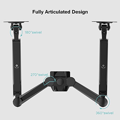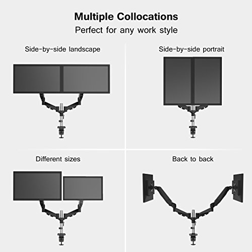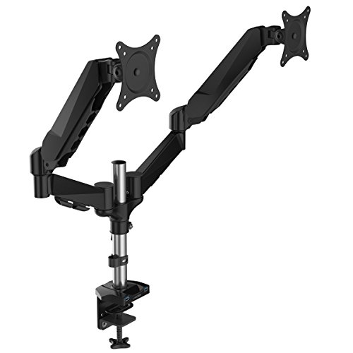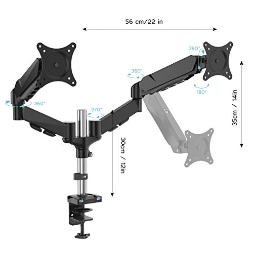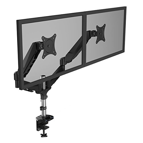 -. Feature : DUAL ARMS: be ready to multitask with this dual monitor desk arm mount; ideal for programmers, designers, and gamers / FULLY ARTICULATED: the sP.R.Ing arm tilts ±45°, the VESA bracket can tilt 90° backward / 85° forward and can rotate 360° for vertical or horizontal viewing / CABLE MANAGEMENT: keep all cables hidden away, tucked neatly under the arm for a clutter-free & well-organized desk / FITS MOST MONITORS: it is VESA compatible (75x75mm or 100x100mm), and fits most 15'' - 27'' flat screens / INCREASES SPACE: by raising the 2 monitors up off your desktop, the unnecessary clutter will reduce, gaining tabletop surface space
