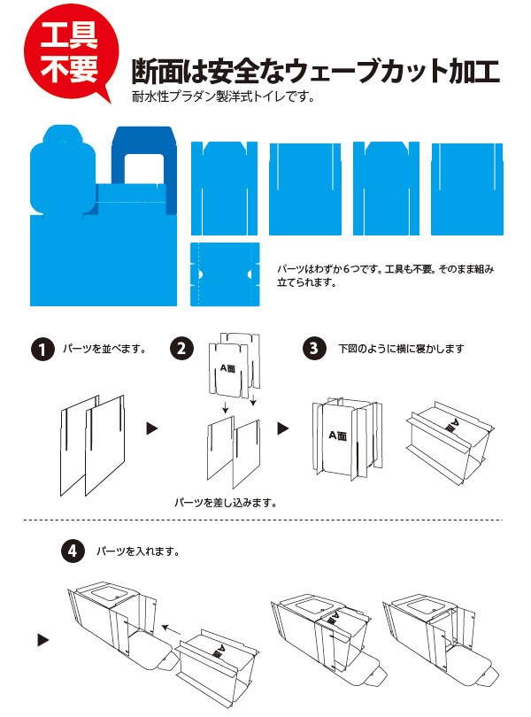 | 水に強くて頑丈、工具不要で簡単に組み立てができます。焼却処分も可能。断面はウェーブカット加工がされており安全です。災害時や非常時に役立ちます。 |