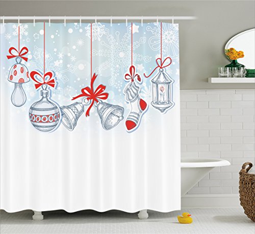 Christmas Shower Curtain Retro Decorations by Ambesonne, Vintage Style Famous Xmas Stockings for Toys and Candy Cane Bells and Snowflake Graphic, Polyester Fabric Bathroom Set with Hooks, White Red