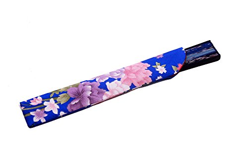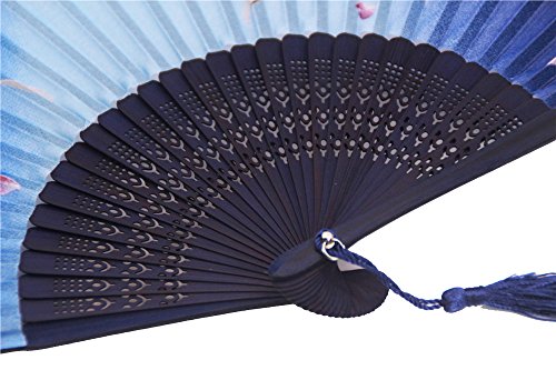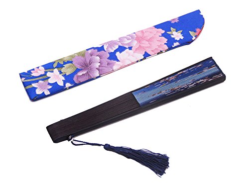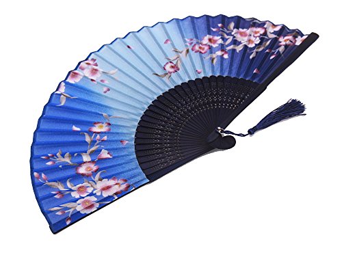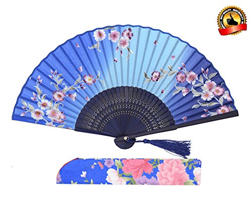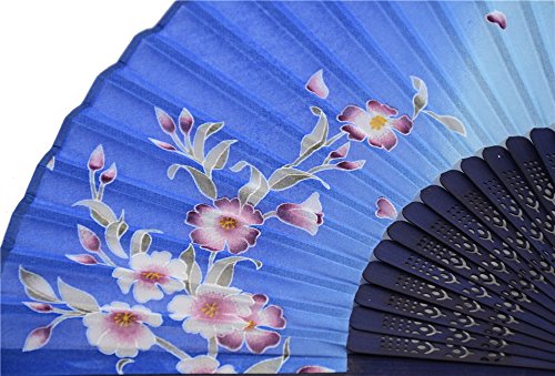 LYSA"Blooming Cherry Blossoms"Folding Hand Held Silk Fan for Women - Silk Tissue Protective Sleeve --- Chinese/Japanese Style (Blue-012)