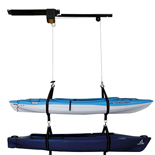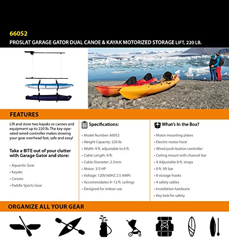 - The proslat Garage Gator dual kayak & Canoe storage Lift includes 220 lb. Motorized Lift, required assembly & installation hardware and key access wired controller & 2 pairs of kayak straps.