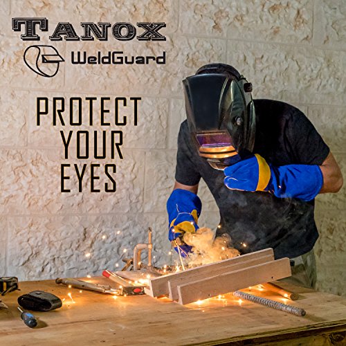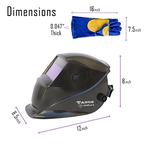 - SPECIAL BONUS ADDED: Every TANOX WELDING AUTO DARKENING HELMET includes Extra set of Lens Cover and a pair of top-quality Grade A 16-inch Welding Gloves that fit most hands; made of a thick double-layer of leather that is fire-retardant with Kevlar stitching thread, they have long sleeves to keep your arms and clothing protected and safe, yet they are pliable and comfortable to wear for long periods; weld safely with this complete set that protects you, your eyes, and your hands