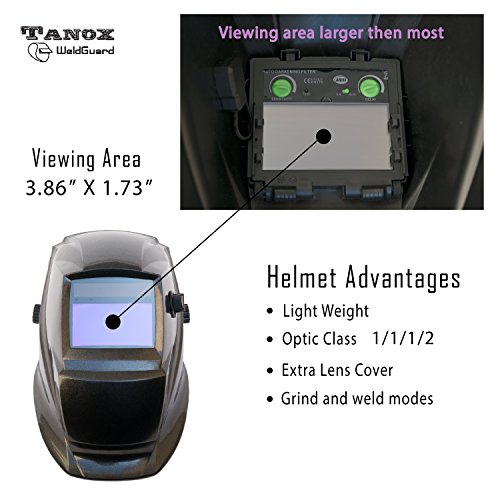 - TOP OF THE LINE WELDING HEADGEAR: The TANOX AUTO DARKENING SOLAR WELDING HELMET ADF-206S is what you need for professional or a DIY Welding, Arc, Tig, Mig, MMA, or plasma project; optical class rating of 1/1/1/2, a 3.86" on 1.73" viewing area, solar shade lens, grinding 0000, fast response time with adjustable 4-9/9-13 range, adjustable sensitivity knobs, the black 8 by 9 by 12 inch helmet weighs 1 pound and includes a pair of 16 inch welding gloves in a box with instructions