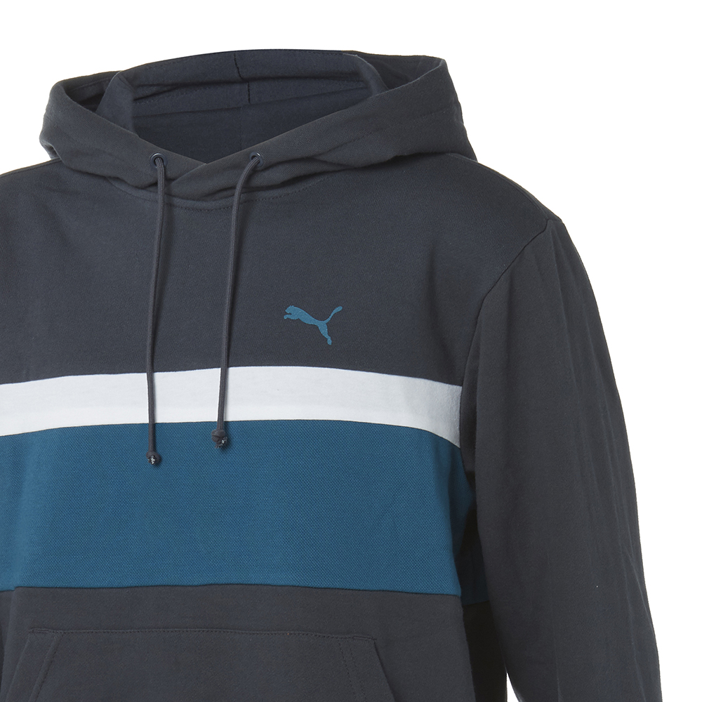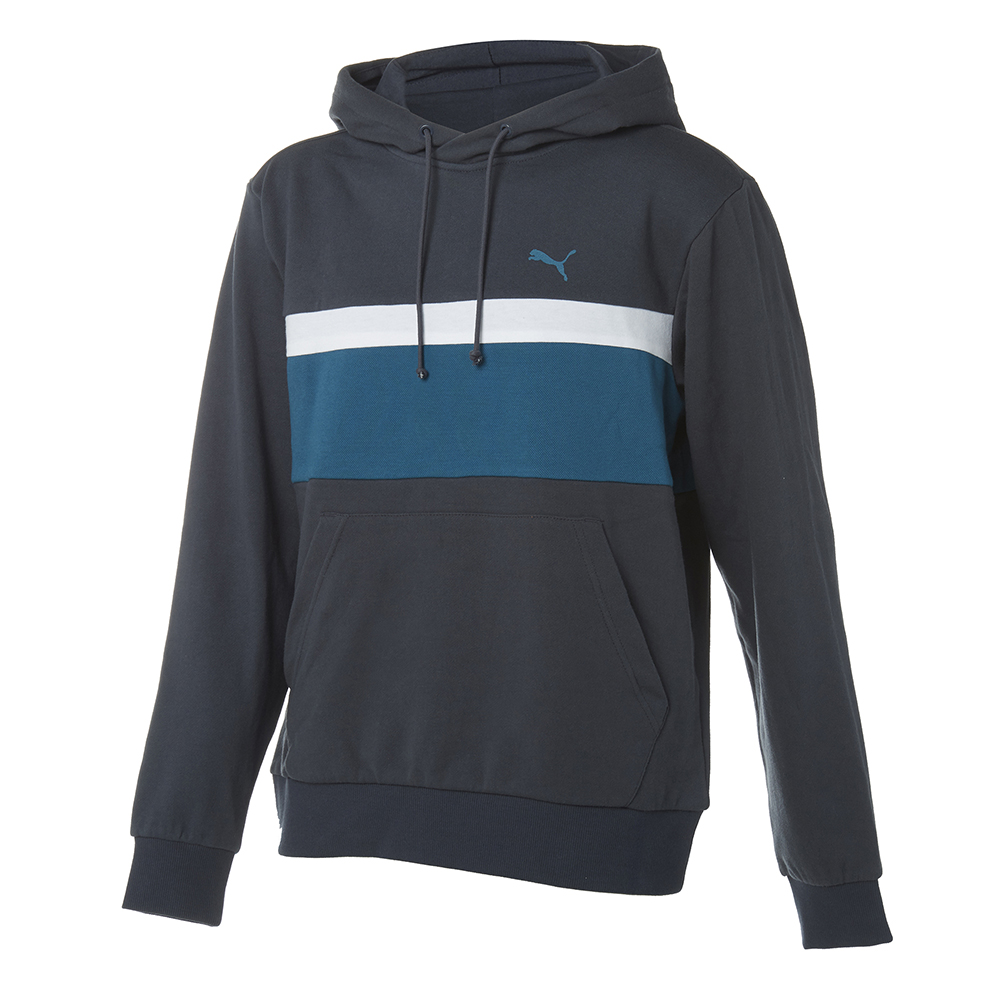 레트로 스포츠 무드의 컬러 블럭킹 오버사이즈 후디.메인 원단과 다른 조직감 있는 배색 소재 사용과