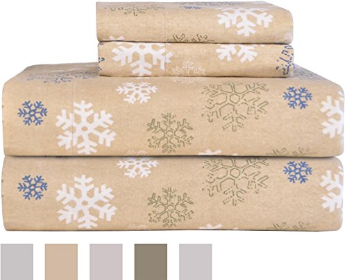 Pointehaven Heavy Weight Printed Flannel Sheet Set, King, Snow Flakes Oatmeal