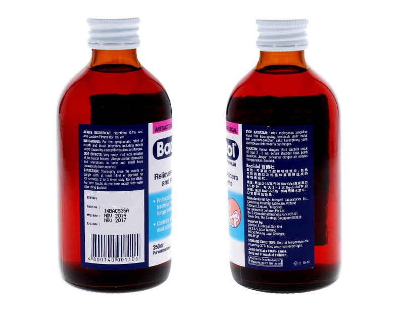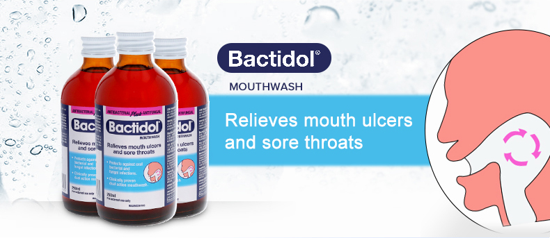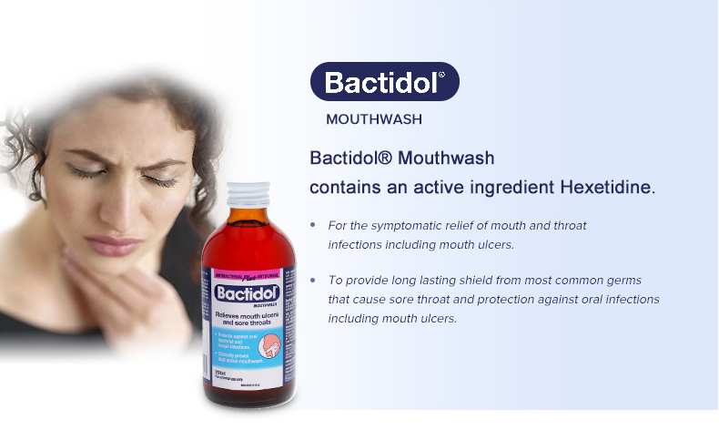 Bactidol® Mouthwash is for the symptomatic relief of mouth and throat infections including mouth ulcers. Bactidol® Mouthwash contains an active ingredient Hexetidine.