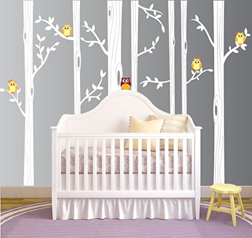 Nursery Birch Tree Wall Decal Set With Owl Birds Forest Vinyl Sticker, Birch Tree Wall Decal, Birch Tree Decal Baby Boy Whimsical Owls (7 trees) #1321 (84" (7ft) Tall, White Trees, Yellow Owls)