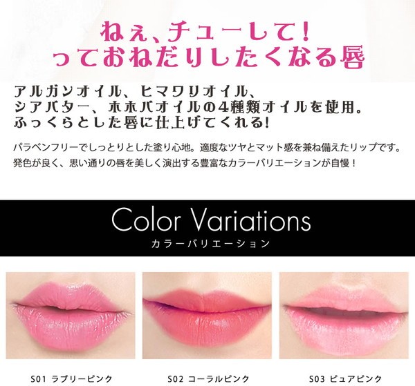| キスを呼ぶ最新トレンドカラー。 パラベンフリーでしっとりとした塗り心地。 適度なツヤとマット感を兼ね備えたリップです。 アルガンオイル・シアバター・ヒマワリオイル・ホホバオイル配合。 |