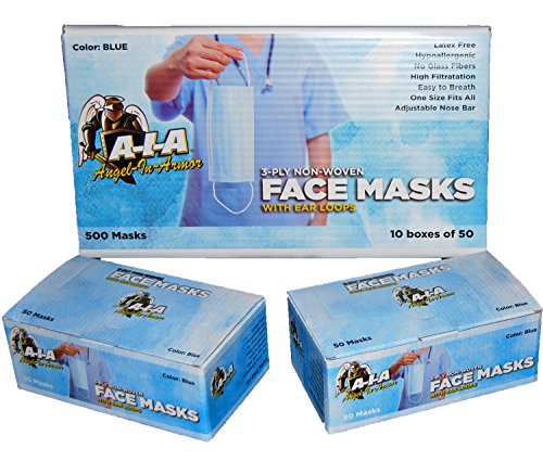 -. Feature : Premium Quality, Blue Color / Latex Free / 10 Boxes of 50 Masks / Adjustable / 3-Ply