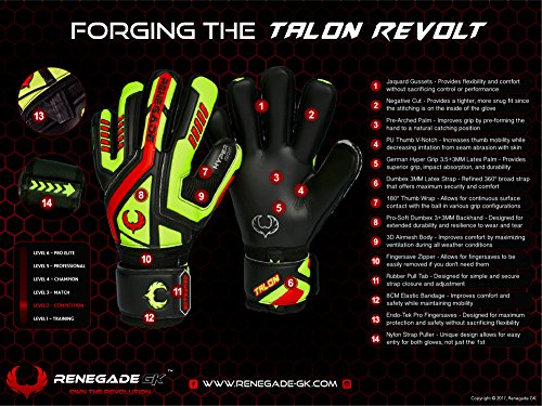 Wearing great goalie gloves makes a big difference for players at all levels. Let's face it, whether you've been playing goalkeeper for 2 years or 20, it's arguably the hardest position to play in soccer. Goalies have to be confident, mentally tough, agile, and have good hands. Their most important tool besides their brains is unquestionably their gloves. We won't claim that Renegade GK gloves will make every player a star keeper. What we can promise is the R-GK gloves will improve a players confidence, performance, and lessen the chance for injury. Knowing that you're wearing gloves with the latest safety, design, and construction methods makes a big difference in how you play. We have a pretty simple philosophy at Renegade GK, make the best valued gloves that we can at each player level. It's about maximizing performance, not our profits. After all, we're keepers too. Every goalkeeper should have access to great gloves without breaking the bank, including you. Talon Glove Specs: - Level - Competition (Lvl 2)
