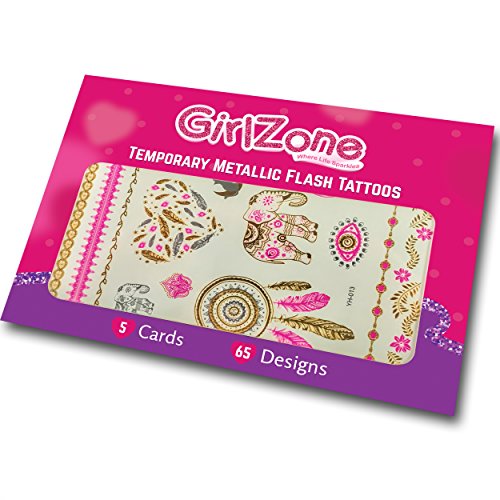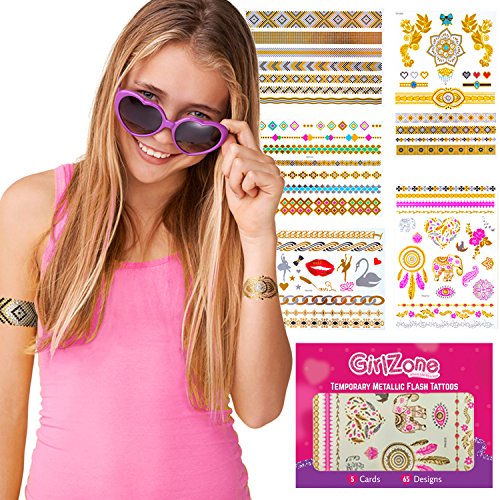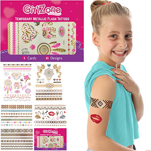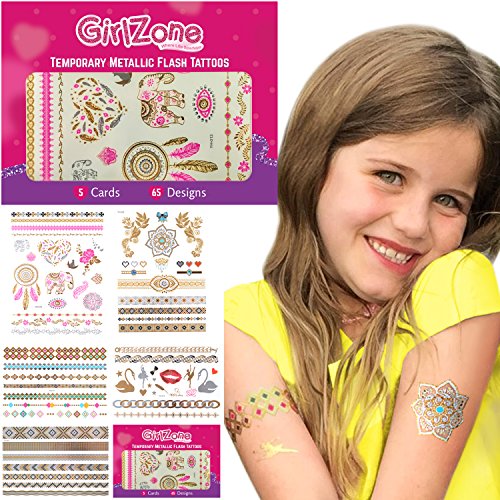 FLASH TATTOOS BIRTHDAY GIFT FOR GIRLS - Metallic, Temporary Flash Tattoos - 5 Card Pack - 65 Designs.. Makes A Great Christmas Birthday Gifts For Girls Aged 4 5 6 7 8 9 10 years old plus.