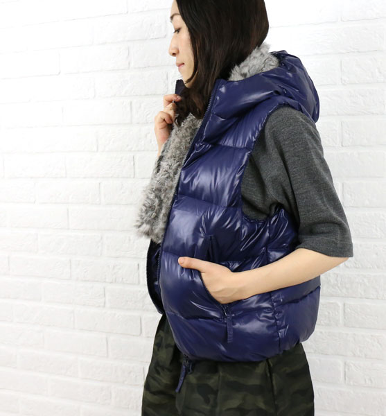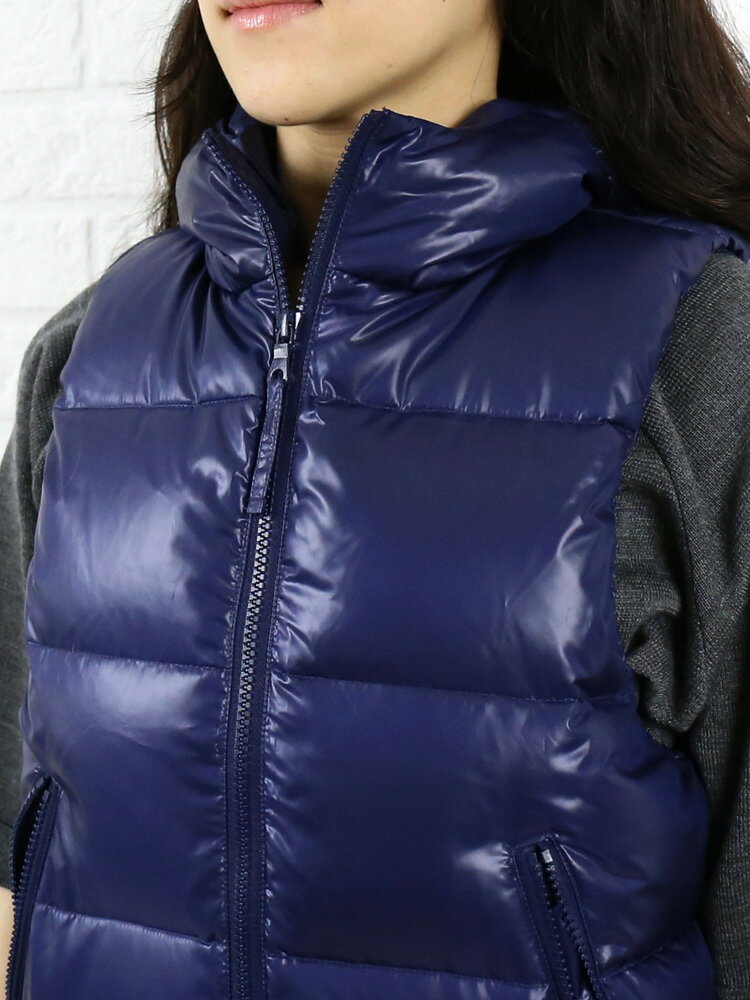aug(オーグ) ポリエステル フード ダウンベスト・843000 【実寸】F(フリー)(着丈55cm、胸囲95cm、肩幅33cm、アームホール56cm)【素材】表地、裏地ともに、ポリエステル100%中綿:ダウン80%、フェザー20%ダウンパック:ポリエステル100%