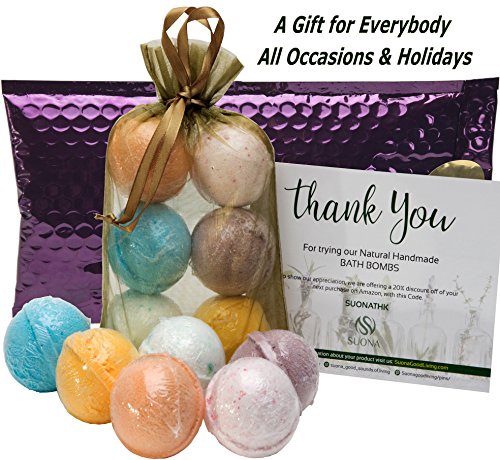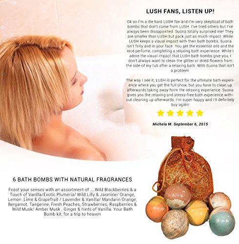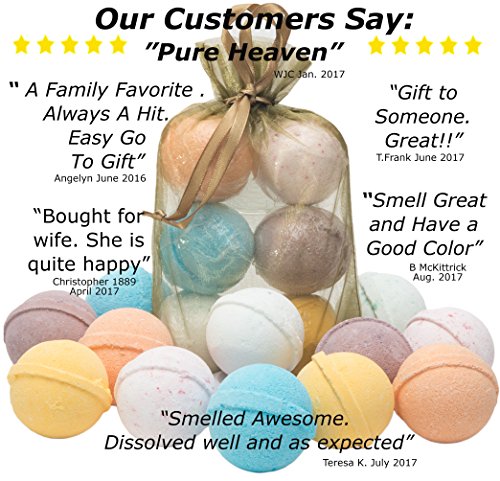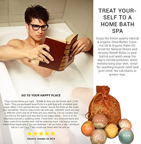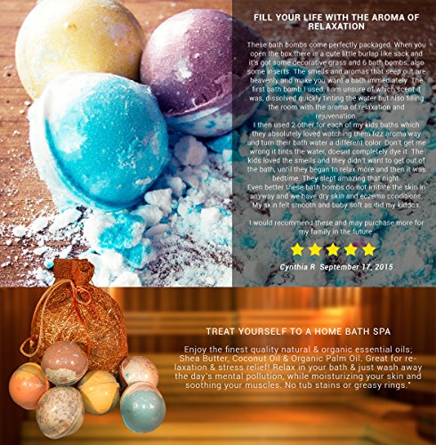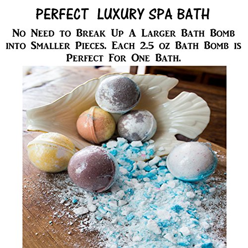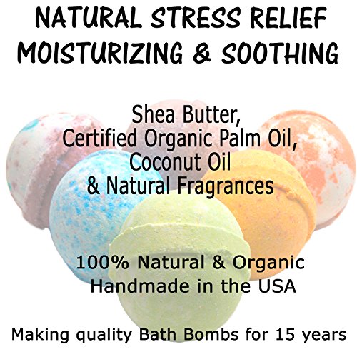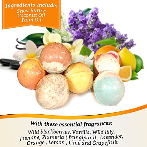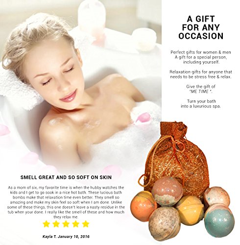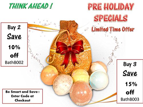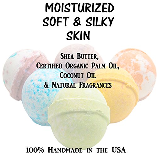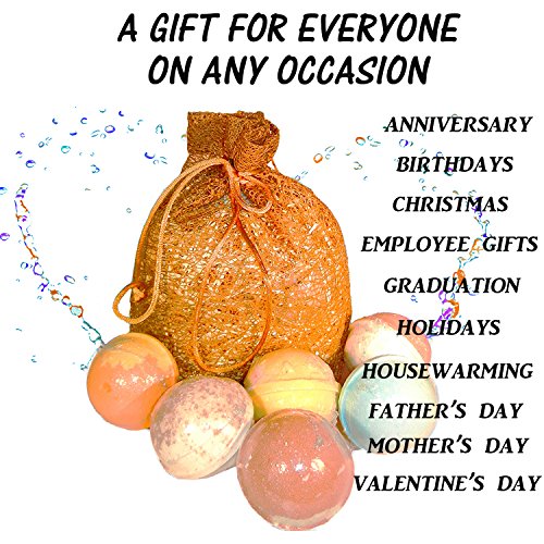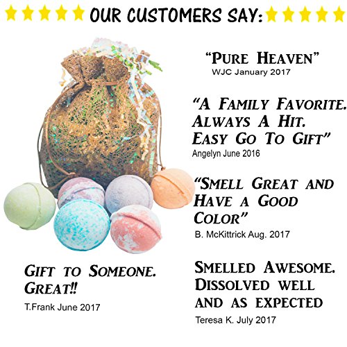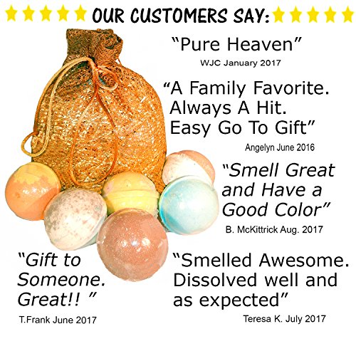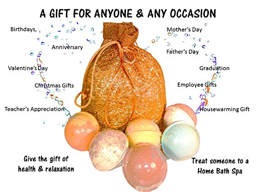 Gift the Art of Pampering. Lush Sensual Essential Oils Natural Fragrances that turn any bath into a natural body spa. 6 Bath Bombs that make Perfect Stress Relief Gifts for Yourself or Friends Pampering is healthy! - Hydrate, Moisturize, Rejuvenate - Our customers prefer our bath bombs to bubble baths! Coconut Oil ? Rich in vitamins, minerals notably vitamin E, ? Penetrates Moisturizes skin ? Strengthening skin Shea Butter ? Used to protect skin help a variety of skin conditions. ? Nourishing skin with Vit. A, E F. ? Vit. A E help maintain the skin keep it clear healthy. A E can help sun damaged skin. These vitamins help prevent premature wrinkles facial lines. Vit. F acts as a skin protector rejuvenator because it consists of two vital fatty acids, linoleic acid alpha-linoleic acid known to revitalize damaged skin. ? Regenerates skin stimulates collagen production making skin stronger healthier Palm Oil ? Contains Vit. E. helps fight free radicals, that damage skin ? Penetrates deep into the skins layers enabling healing protection. ? Helps restore skin's natural oils. ? Keeps skin soft and supple. Citric Acid ? Is known to help shed off dead skin cells and speed new cell turnover. You will love us because there are the right amounts of everything in each Bath Bomb! 100% MONEY BACK if you are not saying "Ahhh" at the end of your bath. Buy Now! Be Good to Yourself or Your Friends. 0 |