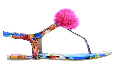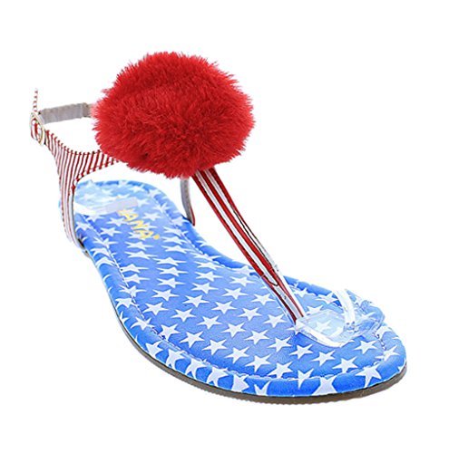 Product DescriptionComfortable but in style! Features include, a canvas fabric, flag print, open toe thong sandal, side buckle closure, pom pom accent and a cushioned foot bed.0