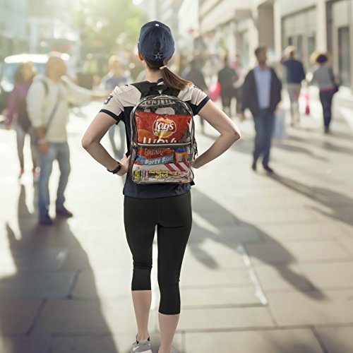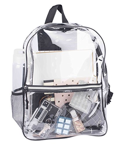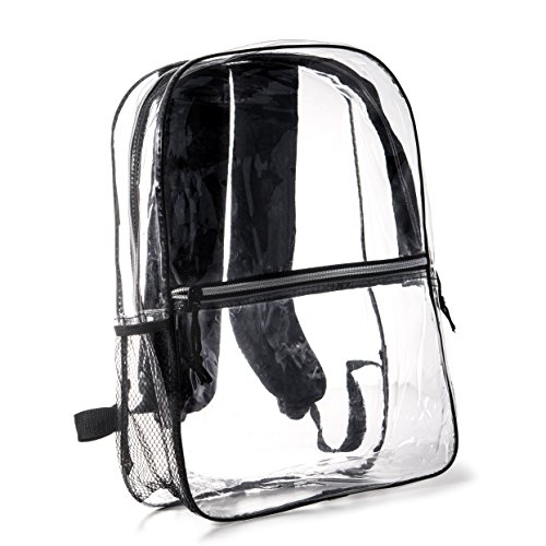 ROOMY & CONVENIENT: Compact and with ample storage space, this makes for an efficient see-through backpack. With a large main compartment, as well as a spacious front zipper pocket for easy access to your most frequently used accessories and a side mesh pocket that can safely hold your mobile phone or a water bottle, this incredibly practical, all clear security rucksack will allow you to have everything you need with you. Dimensions: 12" x 15" x 4"