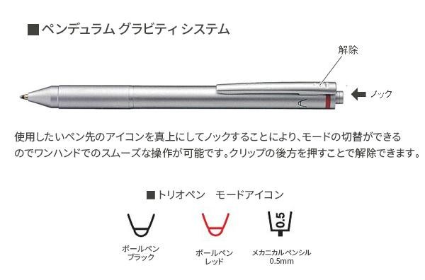 ドイツ生まれの製図・筆記具ブランド「ロットリング」トリオペンシリーズのマルチペンです。ボールペン(黒・赤)と0.5mmメカニカルペンシルの3機能を搭載。ボディに表示されたペン先のアイコンを真上にしてノックすると、そのペン先を出すことができる「ペンデュラム・グラビティシステム」採用。マット仕上げで、シンプルながら存在感を放ちます。 |