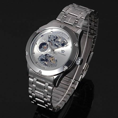 -. Feature : OUYAWEI brand buisness type / Silver stainless steel case and band / Automatic movement ( self winding ) / Folding clasp with safe band / Skeleton back case