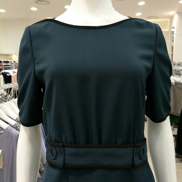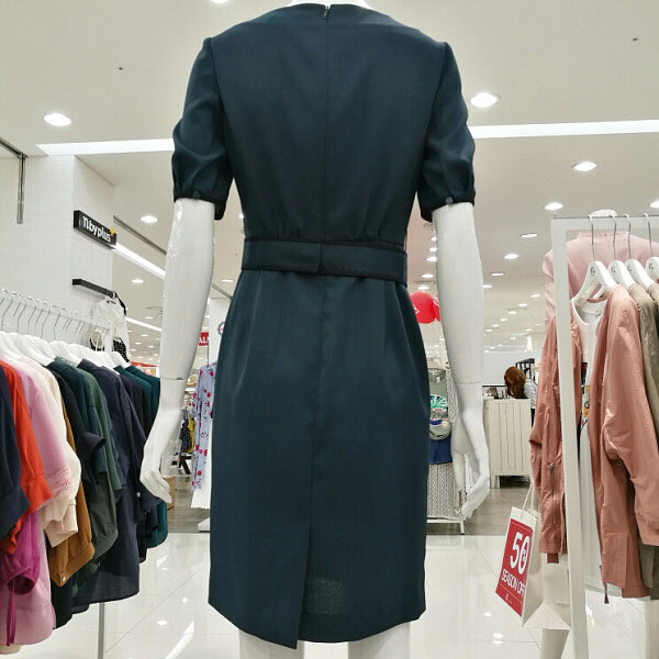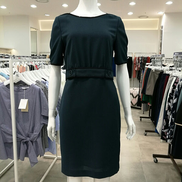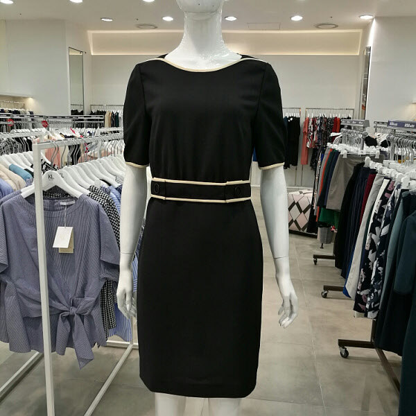 깔끔한 스타일의 정장원피스로서 칼라가 고급스럽고 세련되었으며 가을까지 입을 수 있어 실용적이며 배부분이 커버됨.