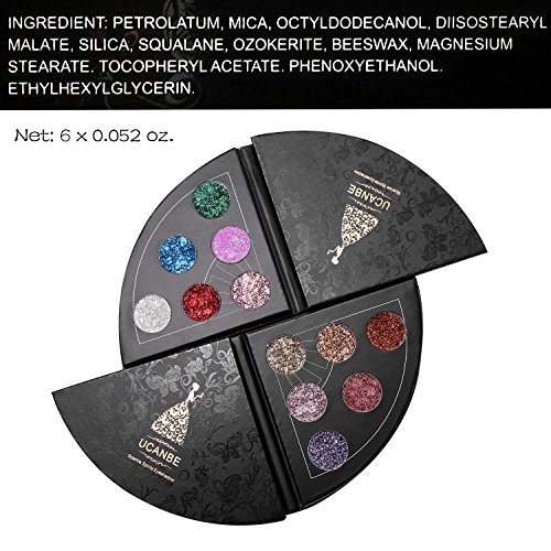 UCANBE 6 Colors Glitter Make-up Powder Metallic Shimmer Eye Shadow Palette Highly Pigmented Mineral Cosmetic Makeup Eyeshadow -Creates bright, luminous eyes -Delivers pure color for a lustrous pearly metallic finish -Long wear and buildable color -ultra-comfortable, soft and silky to apply Sure to fine surprise with this palette