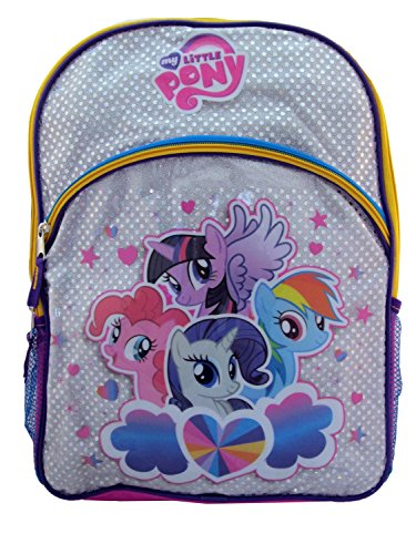 -. Binding : Sports -. Brand : My Little Pony -. Color : Silver Sequins -. Department : girls -. EAN : 0688955832657 -. Feature : Padded adjustable shoulder straps / Padded back / 1 large open top zip compartment / Front open zipper pocket -. Label : My Little Pony -. Manufacturer : My Little Pony -. MPN : KU10383265 -. NumberOfItems : 3 -. PackageQuantity : 1 -. PartNumber : KU10383265 -. ProductGroup : Sports -. ProductTypeName : OUTDOOR_RECREATION_PRODUCT -. Publisher : My Little Pony -. Size : 16" inches -. Studio : My Little Pony -. Title : My Little Pony 16 Backpack Purple Rainbow Silver Sequins -. UPC : 688955832657
