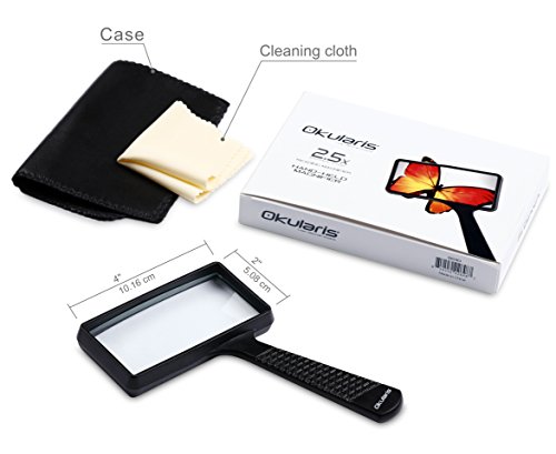 The Okularis® Handheld Reading Magnifier features a 2.5x lens with a wide viewing area (100mm x 50mm), making it ideal for reading thanks to its clear, distortion free magnification.