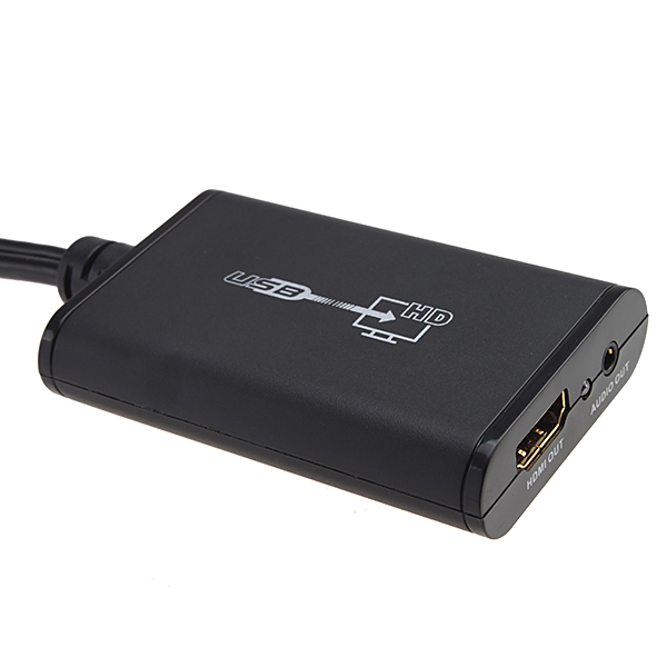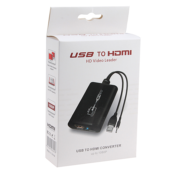 | Resolution: | 1920 X 1080 | | Input: | USB 2.0 | | Output: | HDMI Only | | Operating system: | Windows XP/VISTA/win7/win8/Mac OS X (Based on the user's hardware configuration and operating system, compatibility may be different.) | | Audio input: | 3.5mm Stereo Audio | | Minimum: | System occupation 10% | | Total length: | 67 cm | | Power supply: | 500mA Powered by USB | | Standard: | USB connector Type A | | Total length: | 67cm |