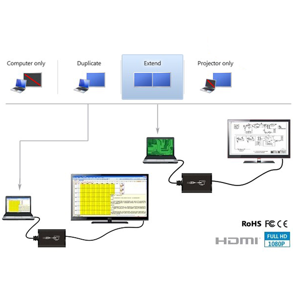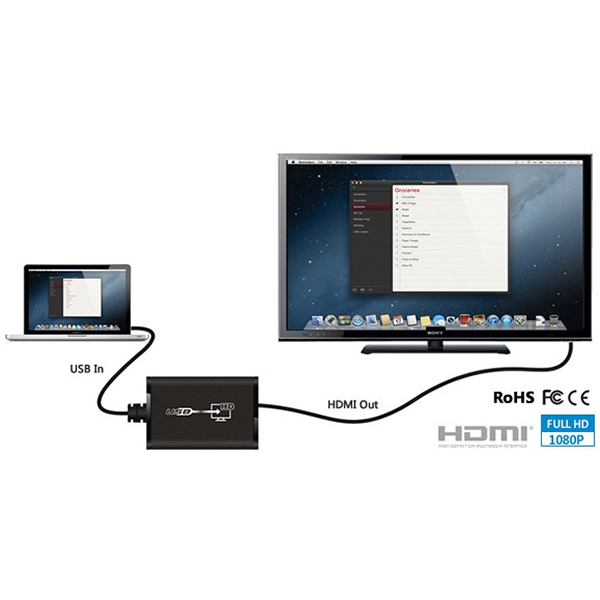 LKV325 USB to HDMI Extend your desktop with high resolution dual or multi display support,It provides you with the easiest and multiple device integration onto a PC or iMac or notebook using its HDMI connections.It is designed to add a HDMI port to any computer (Mac or PC) and has limitless applications in both consumer and commercial environments. From digital signage to home theater, the all new USB2-HDMI provides a simple solution for viewing content from a computer on any HDTV making it the perfect device for any consumer or commercial application. Set up is as simple as plug and play; convenient for any user, no matter the level of technical knowledge.