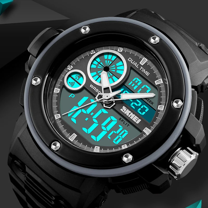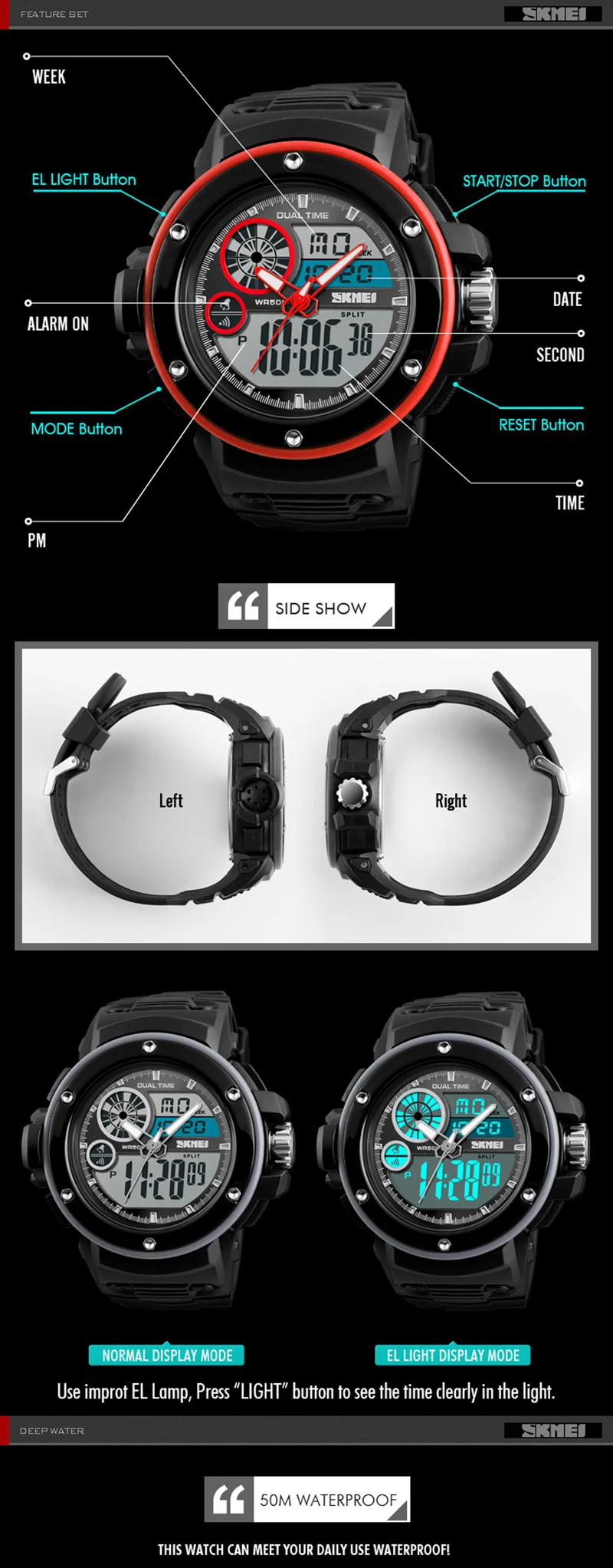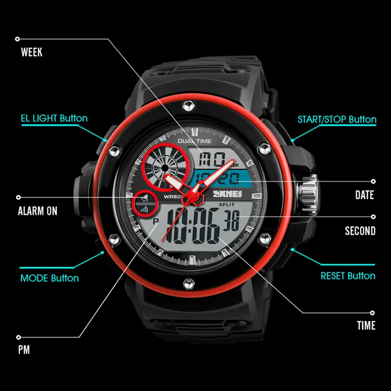Feature:Water Resistant,LED display,Multiple Time Zone,Stop Watch,Back Light,Shock Resistant,Chronograph,Auto Date,Week Display,Alarm