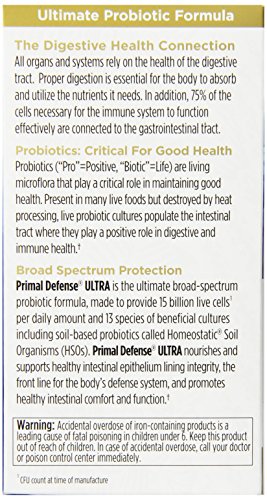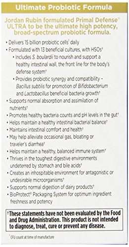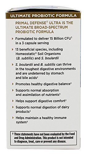 -. Feature : The ultimate high potency, broad-spectrum probiotic formula, providing a 15 billion live cell count** per day of 13 species of beneficial cultures including soil-based probiotics called Homeostatic Soil Organisms. / Supports normal intestinal comfort and function, and promotes healthy intestinal elimination regularity and consistency. Helps maintain a healthy, balanced immune system which is beneficial to overall health. / Contains Bacillus subtilis to support healthy lactic acid bacteria (Bifidobacterium and/or Lactobacillus) count and healthy pH levels in the gut. / The Saccharomyces boulardii in P.R.Imal Defense ULTRA nourishes intestinal mucosa cells to support the normal barrier function of the intestinal epithelium, the front line for the body's defense system. / Delivered via UltraZorbe 100% vegetarian capsules to ensure potency, eliminate the need for fillers and binders, and provide quick nutrient release through faster dissolution into the body. Independent study sests UltraZorbe capsules dissolve more completely than other vegetarian capsules.