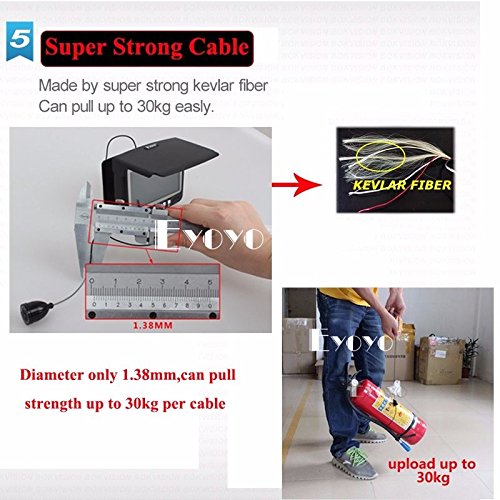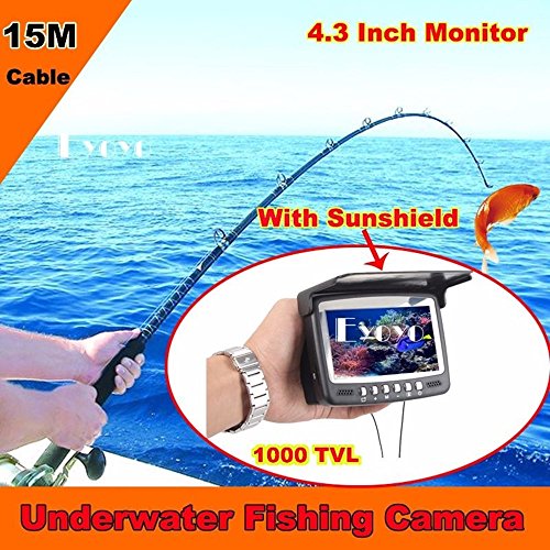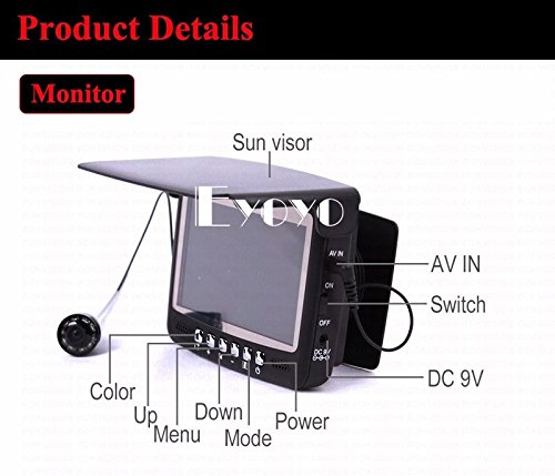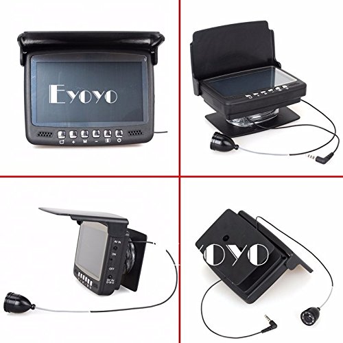 -. Binding : Electronics -. Brand : Eyoyo -. Color : Black -. EAN : 0889251041150 -. Feature : Application field: monitoring aquaculture, underwater exploration, Ocean/Ice/Lake fishing swimming/diving/snorkeling are all available. / Color CCD and HD 1000 TV lines of the camera ; With built in sunshield / The available camera extension cable length: 15m / 4.3 inch TFT color monitor / The continuous using time of the battery is up to 7 hours -. Label : Eyoyo -. Manufacturer : Eyoyo -. Model : 15m fish finder -. MPN : 15m fish finder -. PackageQuantity : 1 -. PartNumber : 15m fish finder -. ProductGroup : CE -. ProductTypeName : CONSUMER_ELECTRONICS -. Publisher : Eyoyo -. Studio : Eyoyo -. Title : Eyoyo 15M 4.3" LCD Ice/Sea Fish Finder 1000TVL Underwater fishing Camera With Sun-visor -. UPC : 889251041150 Description: This product you are watching now is the latest popular, fashional, good looking and convenient Underwater Video Camera System. It not only has a color screen, but also has a height definition camera which has HD 1000 TV lines. There are high-power white lights for camera light source; Monitor specification: 1. 4.3" Color monitor 2. monitor Total Pixels: 960(H) X 240(V) 3. monitor power supply: DC 9V 4. Language: English 5. 16:9 model 6. With built in sunshield 7. Rechargeable Battery: 2600MA Lithium battery, Working time: 6-7 hours 8. Operating Temperature: -20 degree to +60 degree 9. Flexible, light weight and easy to carry Camera specification: 1.Camera size: 35mm x 23mm 2.Camera case material: strong Metal case 3.Camera glass material: sapphire glass 4.Sensor size: 1/3 inch CMOS 5.Total Pixels: 1000 TVL 6.View angle: 130 degree 7.Camera led light: 8PCS white LEDS 8.LEDS adjustable 9.Cable length: 15meters 10.Camerawork current: 80MA 11.Camera power supply: DC 9V 12.Work condition: underwater